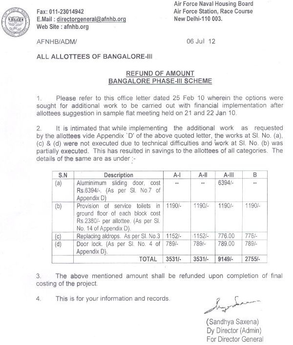 Bangalore Ph-III : Refund of Amount : 6 Jul 12