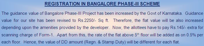 Notice : All Allottees of Bangalore Ph-III are requested to immediately contact Project Office (080-23470239/8088731211) and clear their Electricity Bills failing which the BESCOM authorities would disconnect the supply.