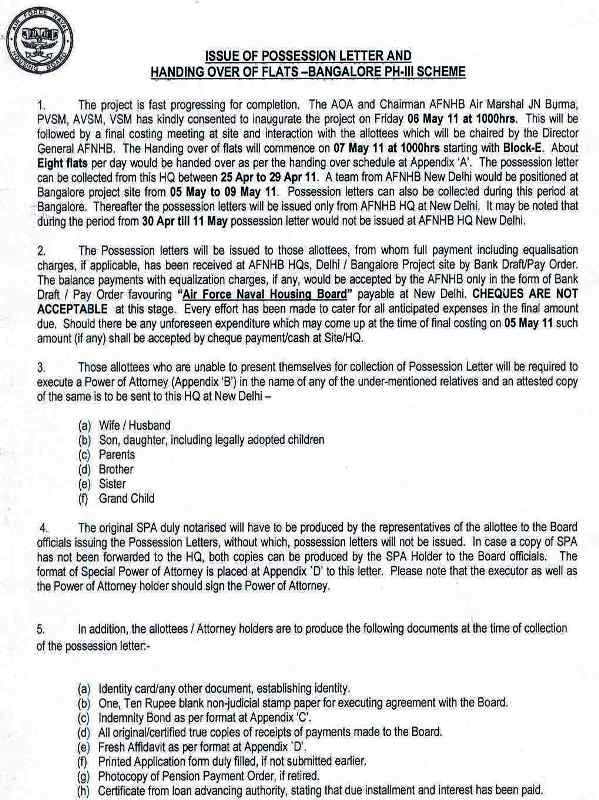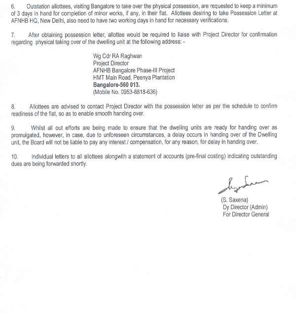 ISSUE OF POSSESSION LETTER : BANGALORE PH-III SCHEME