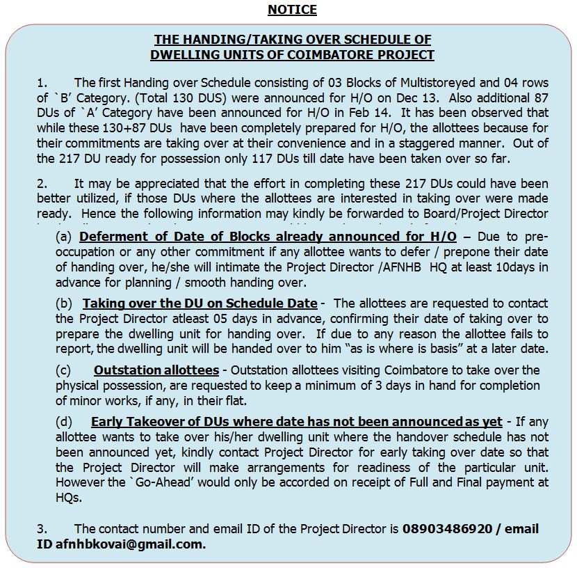 THE HANDING/TAKING OVER SCHEDULE OF DWELLING UNITS OF COIMBATORE PROJECT
