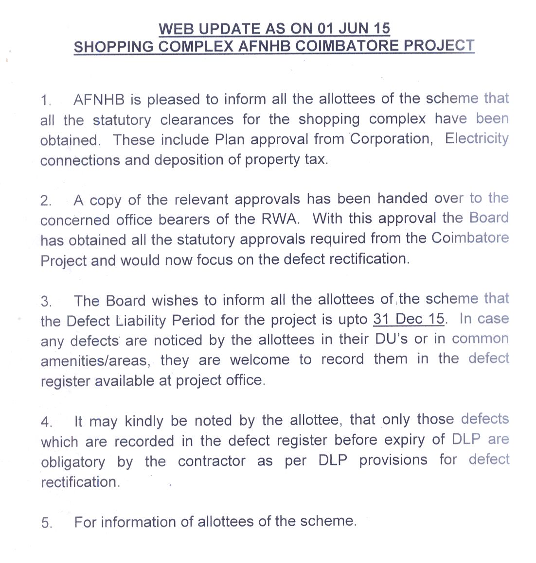 Clarification on common observation by Allottees of Coimbatore Project (Nov 13). more ...