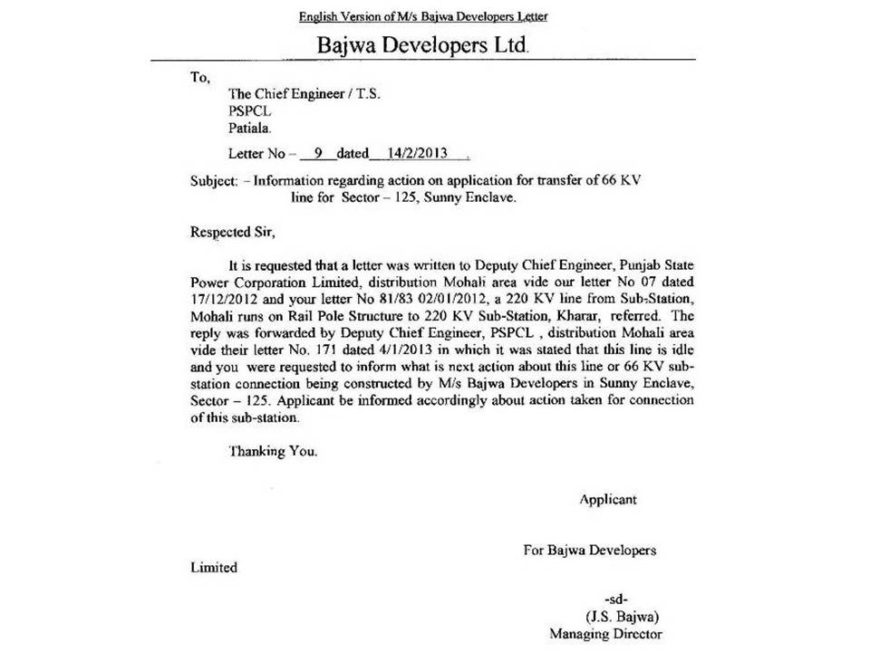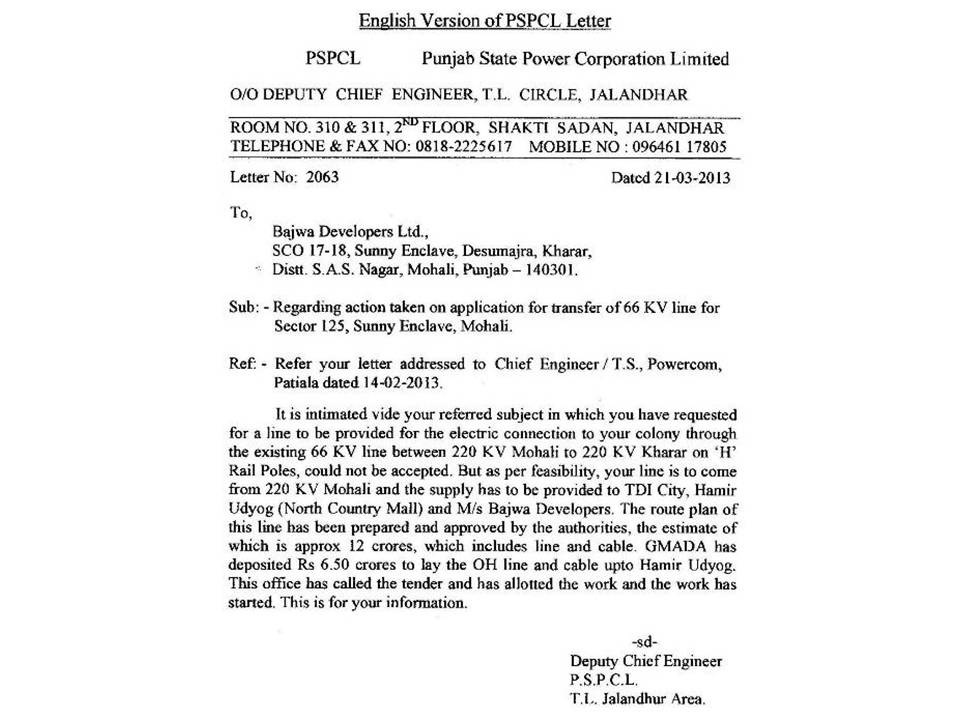 The correspondence regarding laying of 66 KVA HT line from 220 KV Station, Kharar to 66 KVA Station at Sunny Enclave.