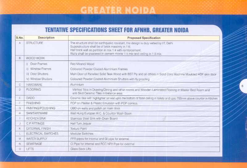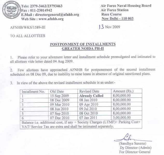 Status:![]() Update on GREATER NOIDA PH-II as on (19 Dec 2014). [Read more....] Greater Noida Ph-II : Defect rectification work. (30 Sep 2014). [Read more....] UPDATE AS ON 30 SEP 2014. 1. Allottees of Greater Noida Phase-II project are informed that the defect rectification work is in progress. The defect liability period (DLP) of the project is valid upto 02 Nov 2014. The defects reported after due date will not be entertained by this Board. The Society has already been intimated vide AFNHB letter dated 22 Aug 2014 in this regard (copy attached). 2. All allottees are once again requested to register / forward their complaints to the Society by 15 Sep 2014. 3. Allottees who have already registered their complaints to the Society, are not required to forward the same. Web Updates (5 Feb 2013).... [Read more....] Web Updates (2 Jul 2012).... [Read more....] | |||||