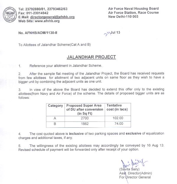 Jalandhar Project : Offer to existing Allottees for two Adjacent Units on same floor.