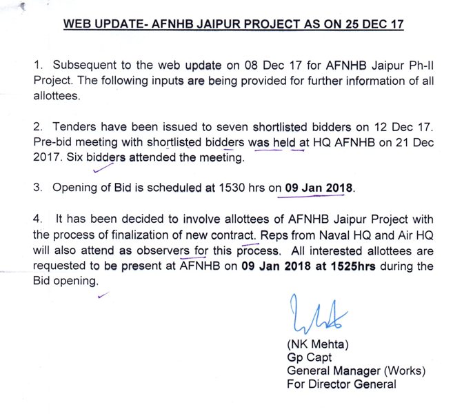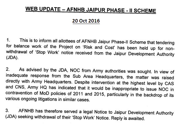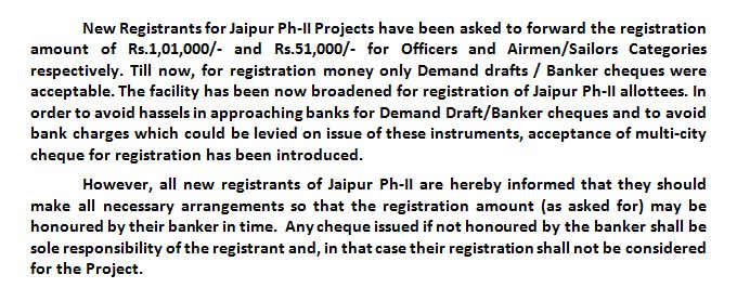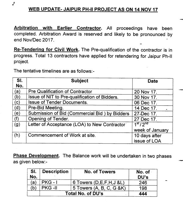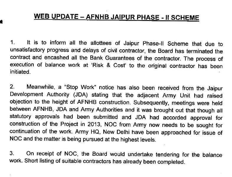 1. It is to inform all the allottees of Jaipur Phase-II Scheme that due to unsatisfactory progress and delays of civil contractor, the Board has terminated the contract and encashed all the Bank Guarantees held as securities of the contractor.
