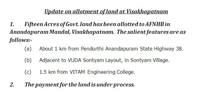 1. AFNHB has approached the Andhra Pradesh Government for allotment of 27-30 acres Government land in Anandapuram Mandal in Feb 2015.